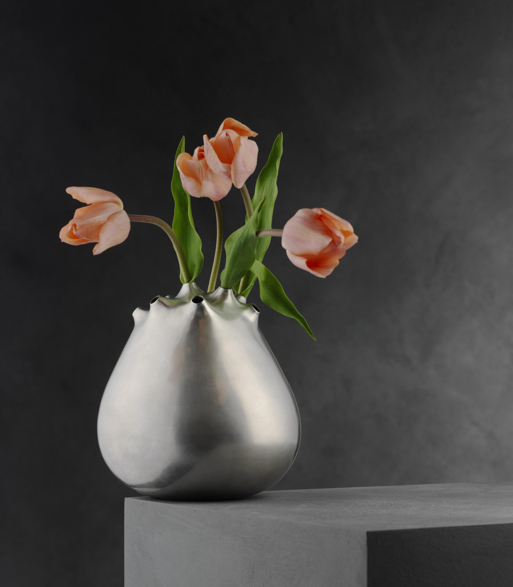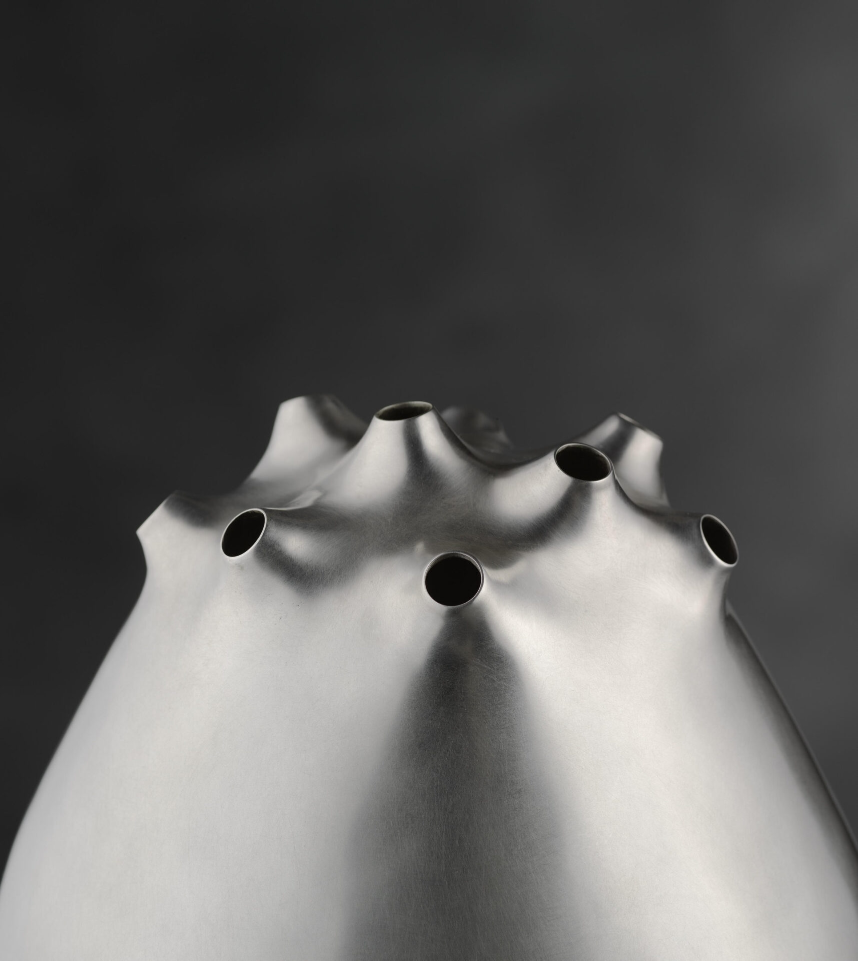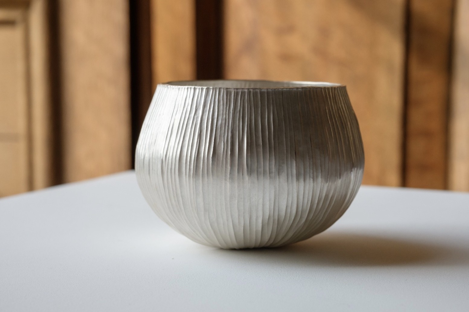 Hannah Keddie is a Glasgow-based silversmith and graduate of Duncan of Jordanstone College of Art & Design, working primarily with the traditional metalworking techniques of raising and chasing. These processes allow her to create bold, fluid forms with intricate surface pattern, blending sculpture with function. Her work explores themes of growth and resilience, crafting playful forms that appear to bud, unfurl and breathe, often seeming soft despite being made in silver.